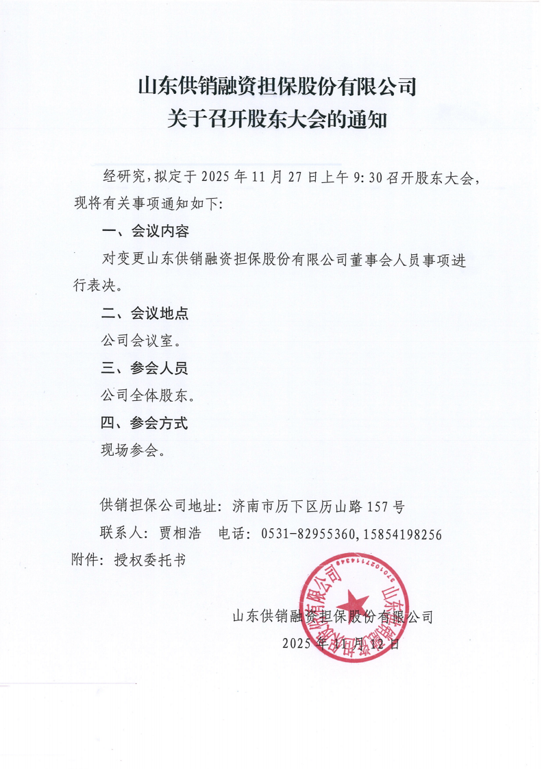 经研究,拟定于2025年11月27日上午9:30召开股东大会,现将有关事项通知如下:一、会议内容对变更山东供销融资担保股份有限公司董事会人员事项进行表决。二、会议地点公司会议室。三、参